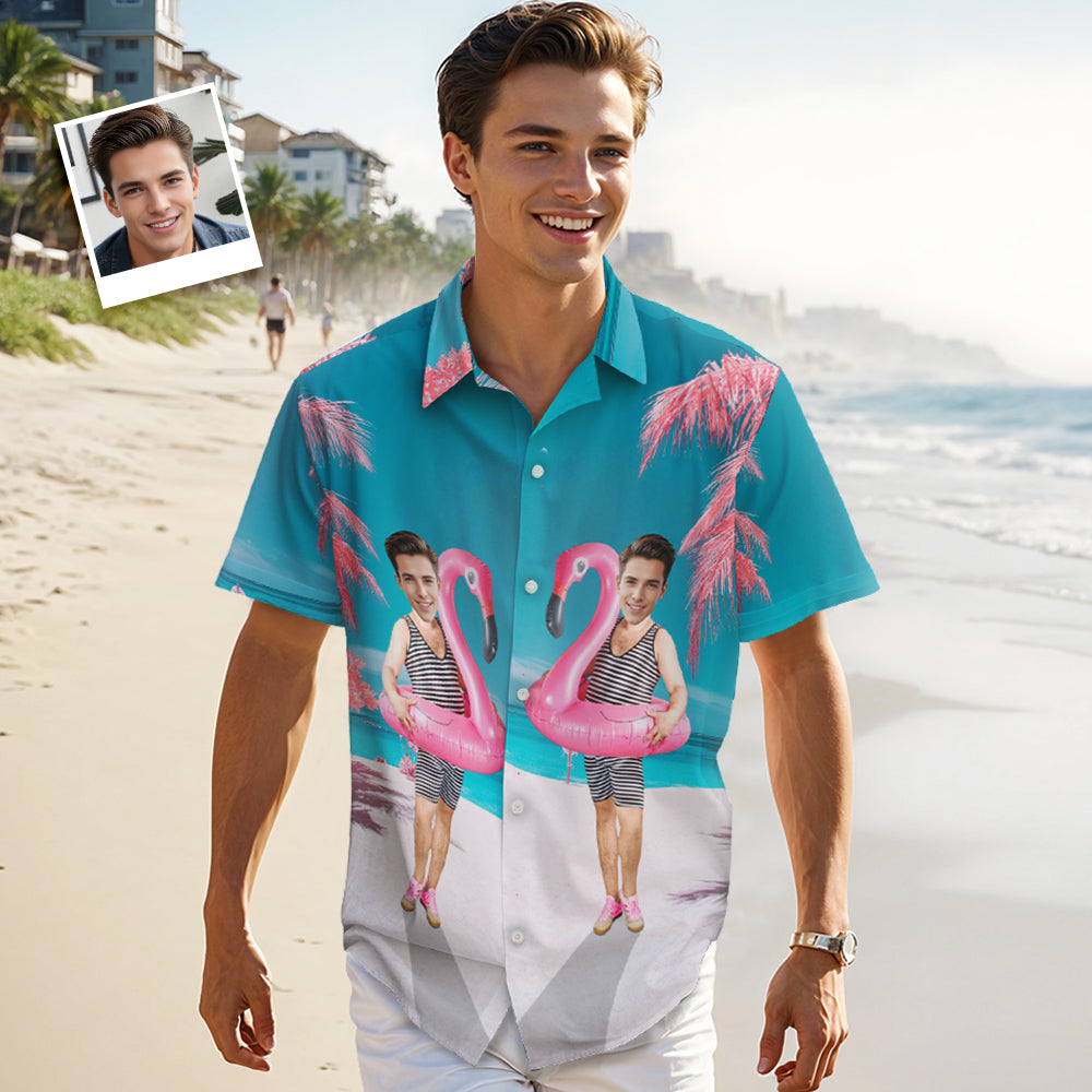 Chemise Hawaïenne Avec Visage Personnalisé, Cocotier Vert, Flamant Rose, Chemise Hawaïenne De Style Tropical