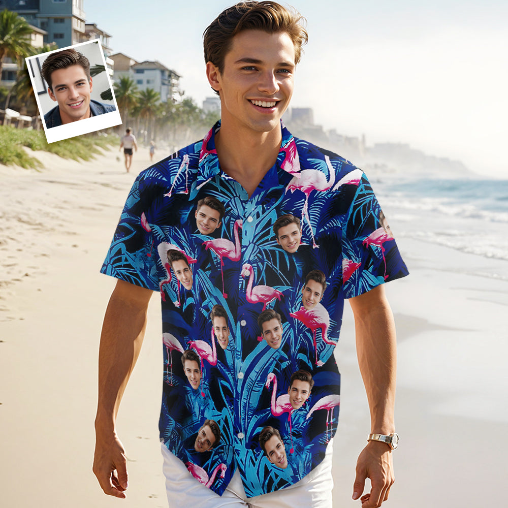 Chemise Hawaïenne Avec Visage Personnalisé, Chemise Hawaïenne Avec Photo De Flamant Rose À Feuilles Bleues