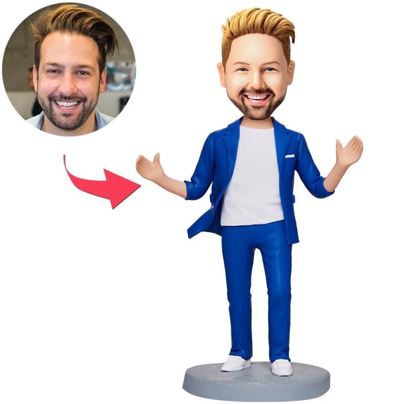 Cadeau Saint Valentin Homme Costume bleu homme d'affaires moderne Bobblehead personnalisé avec texte gravé