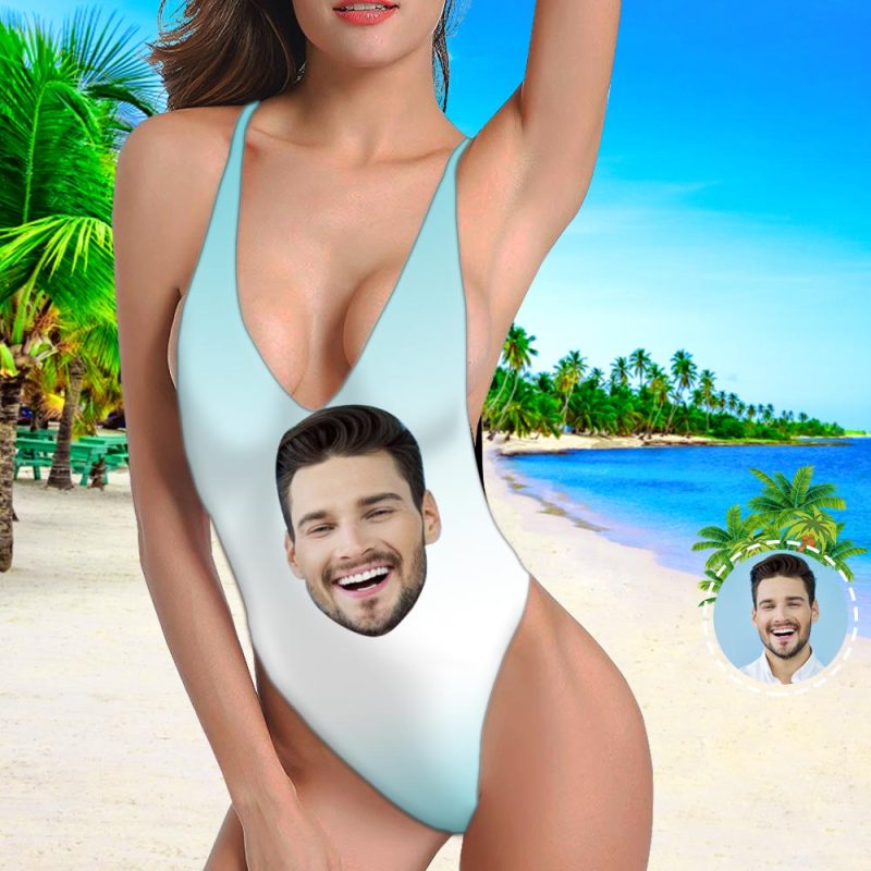 Mon maillot de bain visage Maillot de Bain Personnalisé Col en V avec Visage - Blue Blooming